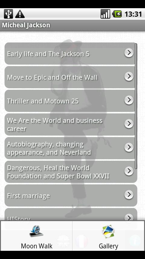 流行音乐之王,被公认为有史以来最成功的艺人。歌手,舞者,歌曲作者。他的奖项包括8个吉尼斯世界纪录,13个格莱美奖和26个广告牌奖。一个必须有MJ爱好者的应用程序。